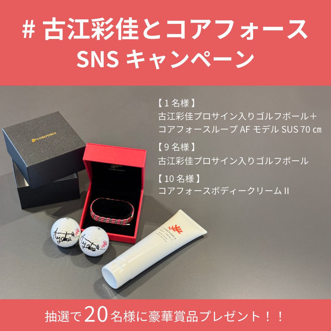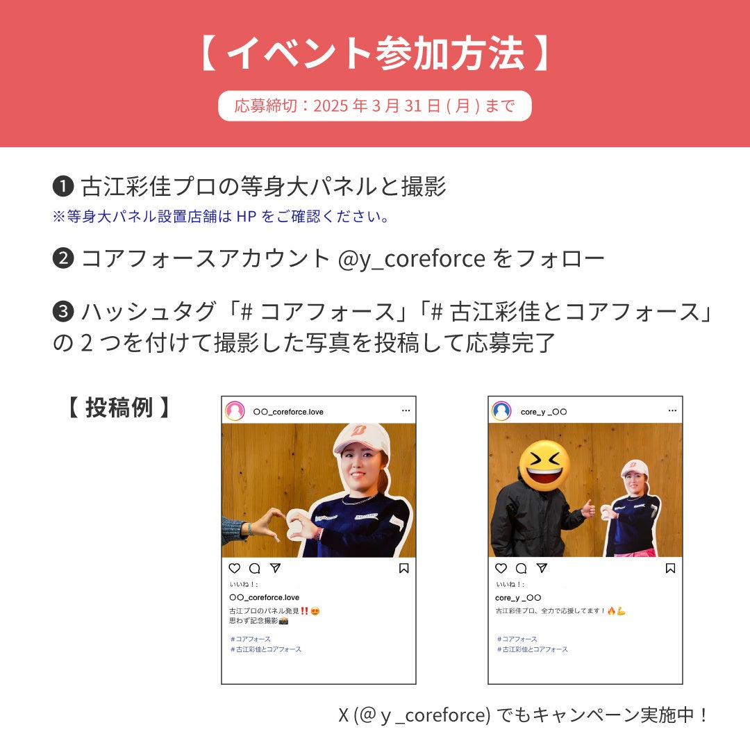 COREFORCE取扱店の約200店舗で古江彩佳プロの等身大パネルを設置。SNSに投稿で古江彩佳プロサイン入りボールとコアフォース製品などが抽選で当たるキャンペーンを実施。